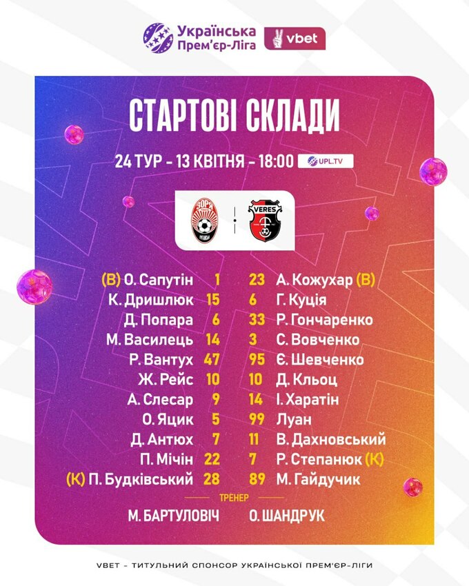 У неділю, 13-го квітня, відбудеться поєдинок 24-го туру Української Прем'єр-ліги, у якому змагатимуться луганська «Зоря» і рівненський «Верес». Матч пройде в Києві, на полі стадіону «Динамо» ім. В. Лобановського, початок о 18:00.