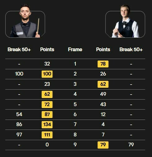 Гра йде до 10 перемог у фреймах. Друга сесія відбудеться 14 квітня о 16:30 за київським часом. Переможець матчу в 4-му раунді зіграє проти Аллана Тейлора (Англія) або Джексона Пейджа (Уельс).