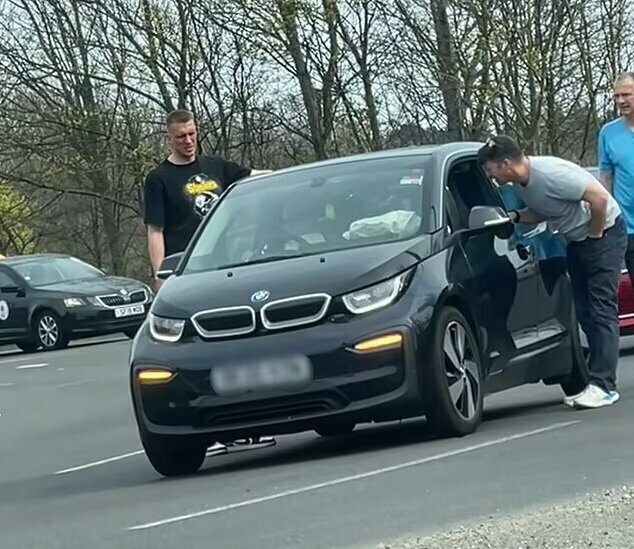 На відео видно, як Берн у футболці та шортах разом із двома людьми штовхає машину.