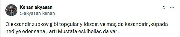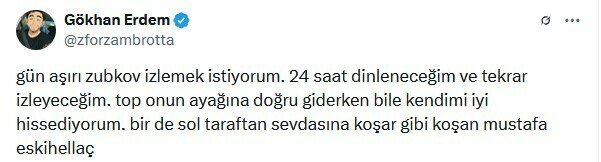 Gökhan Erdem: Хочу подивитись Зубкова через день. Я відпочину 24 години та подивлюся ще раз. Навіть коли м'яч летить до його ніг, я почуваюся добре. І Мустафа Ескіхеллач, який біжить ліворуч, ніби біжить до свого кохання.