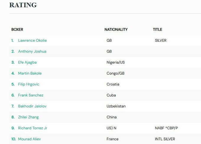 Перші два місця в рейтингу посідають британці Лоуренс Околі та Ентоні Джошуа. Трійку найсильніших замикає представник Нігерії Ефе Аджагба.