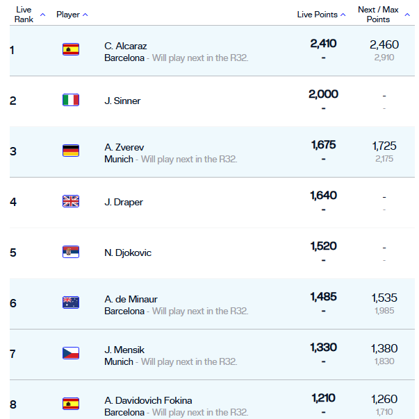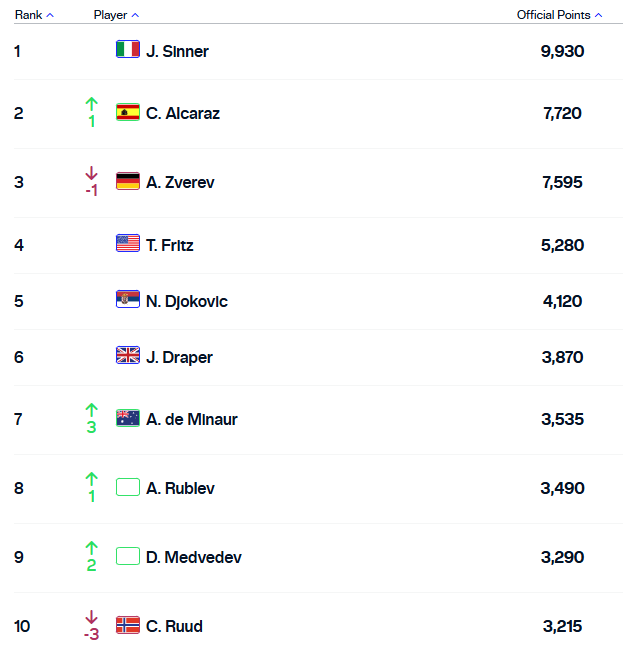 У топ-3 також перебуває Александр Звєрєв. Новак Джокович замикає першу п'ятірку, а на 4-й позиції розташовується Джек Дрейпер.