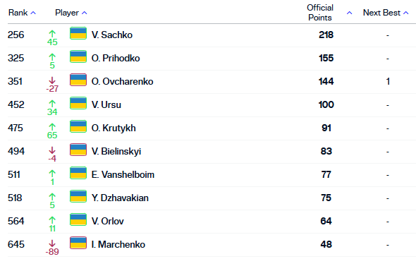 З українців суттєвий прогрес у Вадима Урсу та Олексія Крутих. Олександр Овчаренко втратив аж 27 місць.