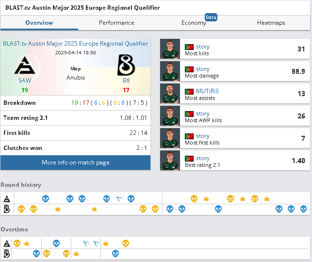 14 квітня в рамках кваліфікаційного етапу до Austin Major українська команда B8 провела надзвичайно напружений матч проти португальського колективу SAW на мапі Anubis. Це була справжня битва характерів, яка тривала до останнього пострілу й завершилася лише після двох овертаймів із рахунком 19:17 на користь SAW. Українцям не вистачило всього одного раунду, аби перевести гру в третю серію додаткового часу.