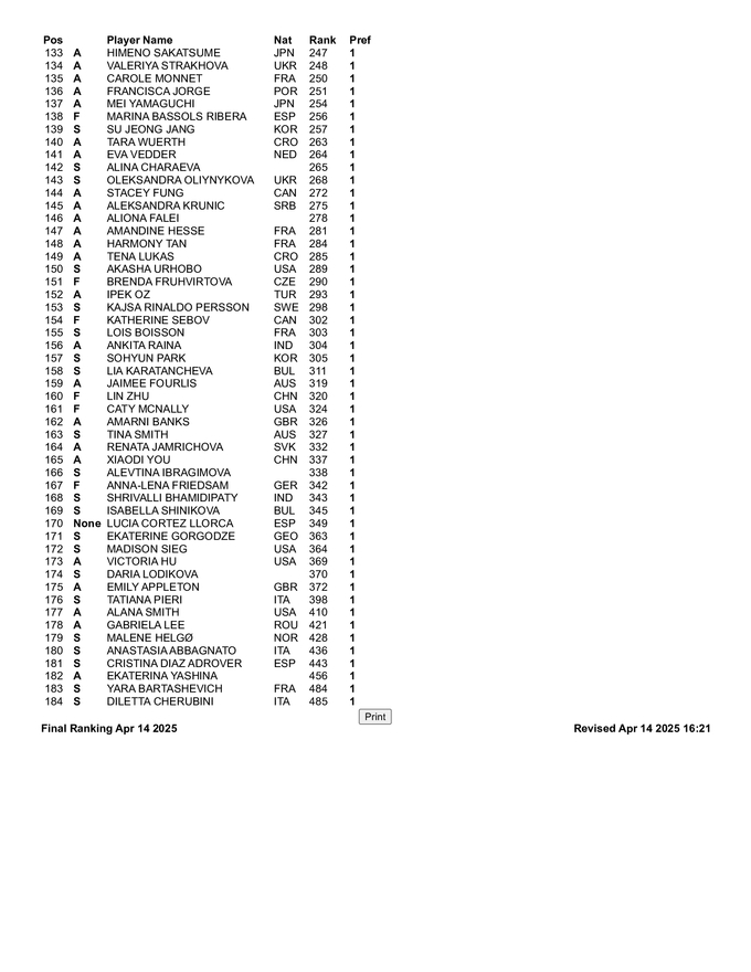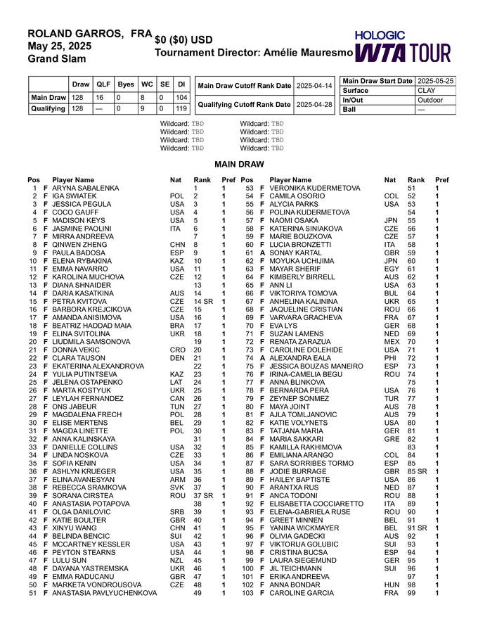 Заявочний лист на Ролан Гаррос 2025 у жінок: