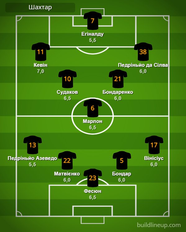 «Шахтар»: Фесюн – Педріньйо Азеведо, Матвієнко, Бондар, Вінісіус – Судаков, Марлон, Бондаренко – Кевін, Егіналду, Педріньйо да Сілва.