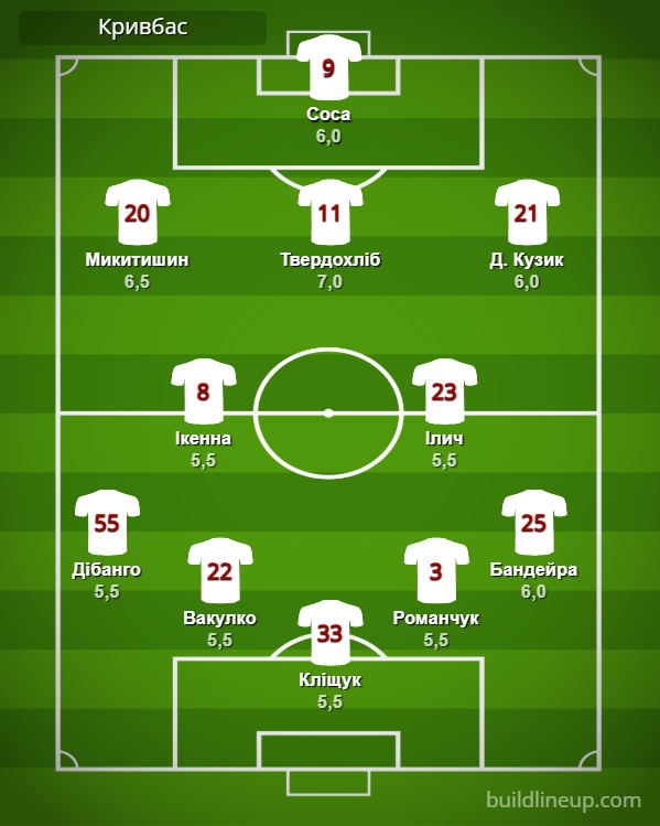 «Кривбас»: Кліщук – Дібанго, Вакулко, Романчук, Бандейра – Ікенна (Понєдєльнік, 67), Ілич – Микитишин, Твердохліб, Д. Кузик – Соса.