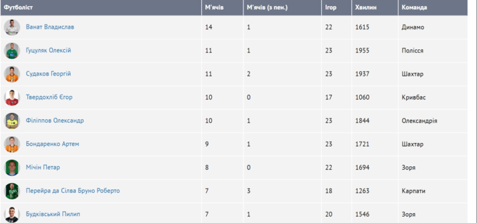 Він випереджає хавбека Полісся Олексія Гуцуляка та півзахисника Шахтаря Георгія Судакова, які забили по 11 голів.