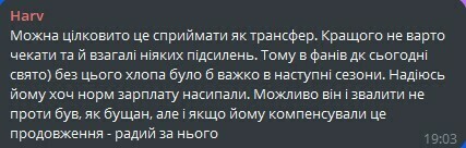 Harv: Можна цілковито це сприймати як трансфер. Кращого не варто чекати та й взагалі ніяких підсилень. Тому в фанів ДК сьогодні свято) без цього хлопа було б важко в наступні сезони. Надіюсь йому хоч норм зарплату насипали. Можливо він і звалити не проти був, як Бущан, але і якщо йому компенсували це продовження - радий за нього.