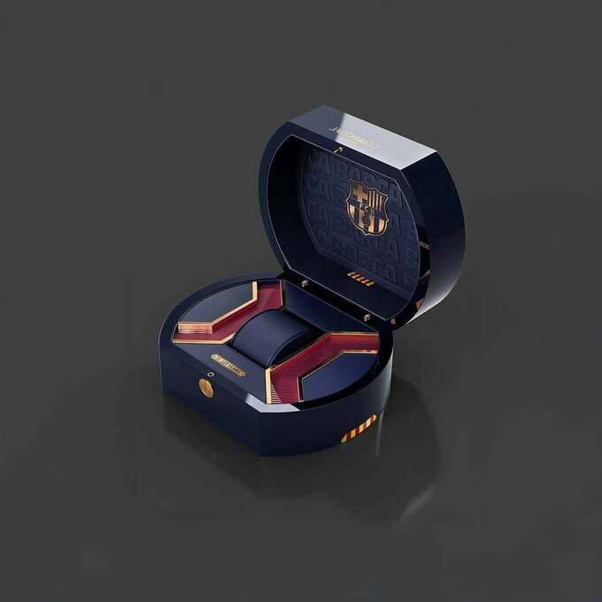 Корпус аксесуара виконаний з 18-каратного рожевого золота, а скелетонізований циферблат прикрашений елементами в стилі «блаугранас».
