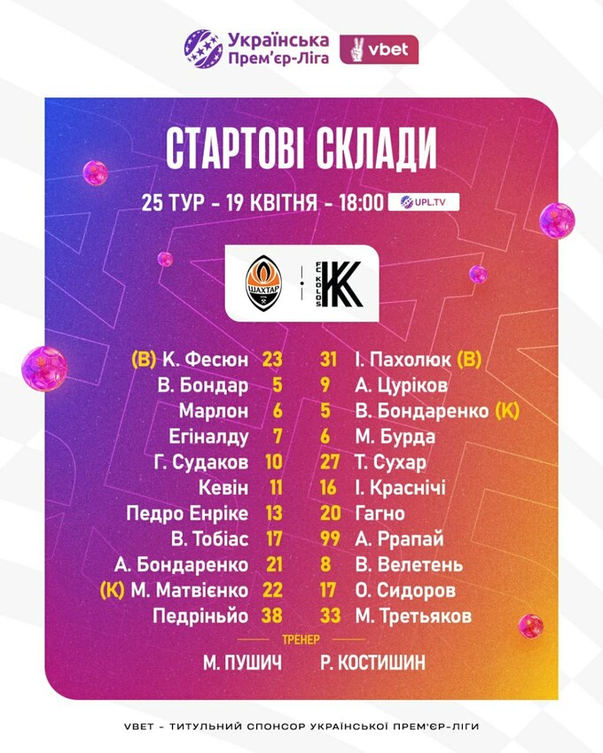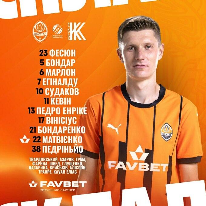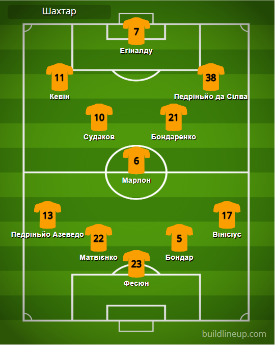 «Шахтар»: Фесюн – Педріньйо Азеведо, Матвієнко, Бондар, Вінісіус (Аліссон, 86) – Судаков (Криськів, 86), Марлон, А. Бондаренко – Кевін, Егіналду (Траоре, 86), Педріньйо да Сілва (Еліас, 86).