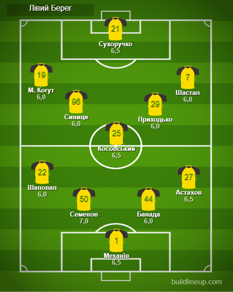 «Лівий Берег»: Механів – Шаповал, Семенов, Банада, Астахов – М. Когут (І. Когут, 76), Синиця (Галас, 76), Косовський, Приходько (Якимів, 85), Шастал (Войцеховський, 76) – Сухоручко