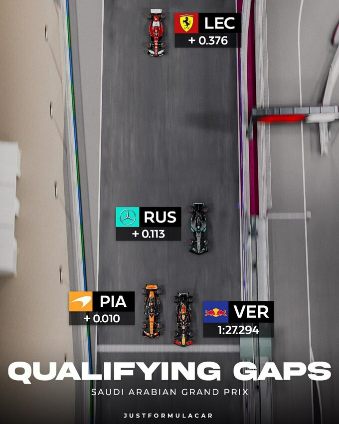 До цієї події JUST FORMULACAR підготували візуалізацію відривів у кваліфікації Саудівської Аравії, яка показує розриви між пілотами Ред Булла, Макларена, Мерседеса і Феррарі:
