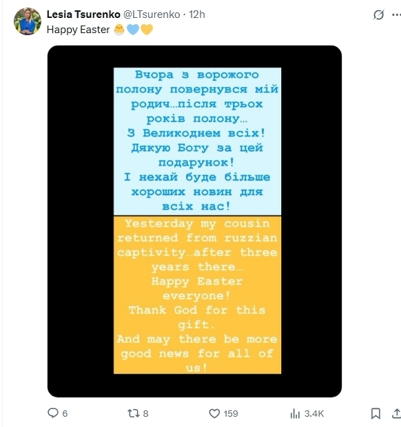 Українська тенісистка, переможець чотирьох турнірів WTA в одиночному розряді Леся Цуренко повідомила в соціальній мережі, що її родич повернувся додому після трьох років полону.