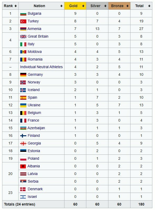 У медальному заліку ЧЄ-2025 перші сходинки посіли команди Туреччини, Болгарії та Вірменії. Українська команда – на 17-й позиції за великими нагородами та на 12-й сходинці з врахуванням малих медалей.