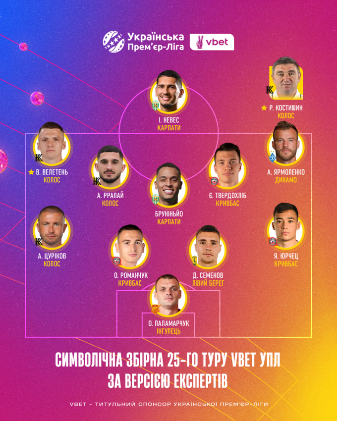 Звання найкращого гравця 25-го туру отримав лівий вінгер Владислав Велетень («Колос»), який видав неймовірний перфоманс у переможному матчі з «Шахтарем» (4:2) – гол та три результативні передачі.