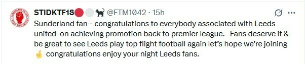STIDKTF18: Я фанат «Сандерленда» – вітаю всіх, хто пов’язаний з «Лідсом», з поверненням до прем’єр-ліги. Вболівальники заслуговують на це, і буде приємно бачити, як «Лідс» знову грає у футбол вищого дивізіону, сподіваємося, що ми приєднаємось, вітаємо, приємного вечора, фанати «Лідса».