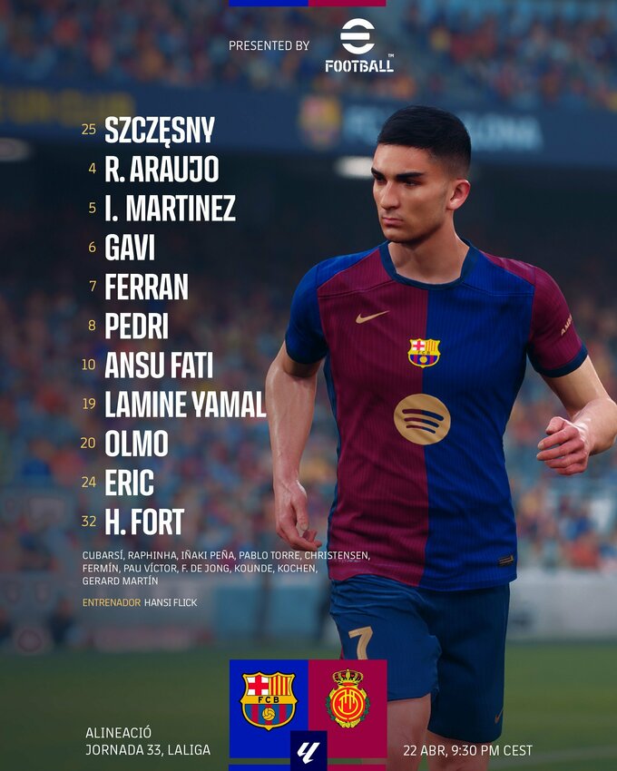 «Барселона»: Щенсни - Форт, Мартінес, Гарсія, Араужо - Педрі, Ольмо, Гаві - Фаті, Торрес, Ямаль.