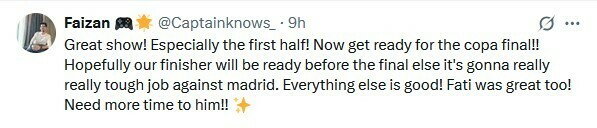 Faizan: Чудове шоу! Особливо перший тайм! Тепер готуйтеся до фіналу кубка! Сподіваюся, наш фінішер буде готовий до фіналу, інакше буде дуже важка робота проти Мадрида. Все інше добре! Фаті теж був чудовий! Йому потрібно більше часу!