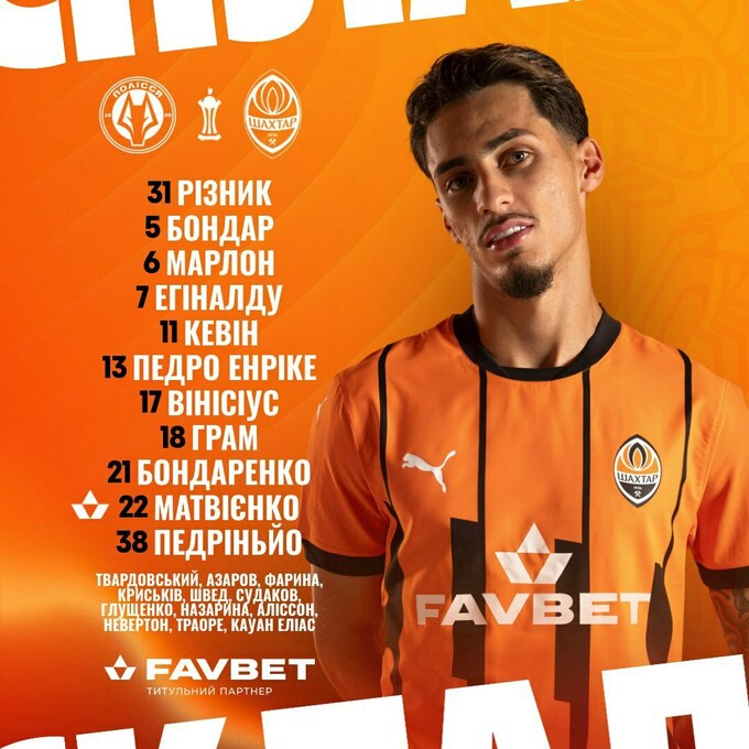 «Шахтар»: Різник, Грам, Бондар, Матвієнко, Вінісіус Тобіас, Бондаренко, Марлон, Педро Енріке, Педріньйо, Егіналду, Кевін.