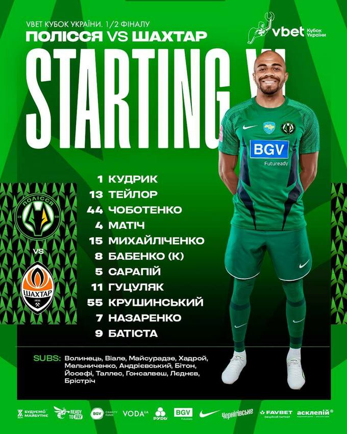 «Полісся»: Кудрик, Тейлор, Чоботенко, Матич, Михайліченко, Сарапій, Бабенко, Гуцуляк, Крушинський, Назаренко, Батіста