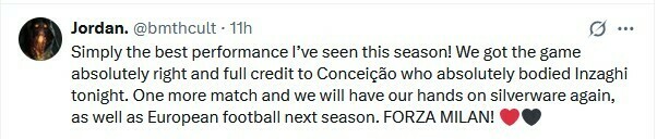 Jordan: Просто найкращий виступ, який я бачив цього сезону! Ми зіграли абсолютно правильно, і вся заслуга в цьому належить Консейсау, який сьогодні ввечері просто вибив Індзагі. Ще один матч, і ми знову братимемо до рук трофеї, а також отримаємо європейський футбол наступного сезону. FORZA MILAN!