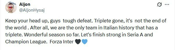 Aljon: Не опускайте голови, хлопці, важка поразка. Требл пішов, це не кінець світу. Зрештою, ми єдина команда в історії Італії, яка має требл. Поки що чудовий сезон. Давайте закінчимо Серію А та Лігу чемпіонів на найвищому рівні. Forza Inter.