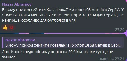 Nazar Abramov: В чому прикол хейтити Коваленка? У хлопця 68 матчів в Серії А. У Ярмоли в топ 4 меньше. У Коно теж. Норм кар'єра для серіала, не найгірша, особливо для футболістів УПЛ.