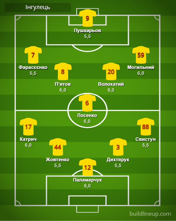 «Інгулець» (заміни): Сад – 6,0, Бенедюк – 6,0, Чабан – 6,0, Гаджук – 6,0, Кисленко – б/о.
