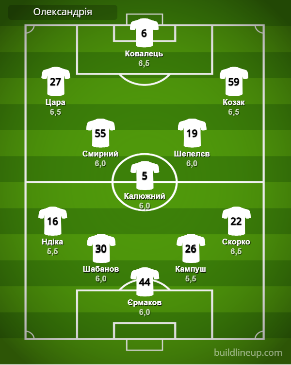 «Олександрія»: Єрмаков – Ндіка (Мартинюк, 46), Шабанов, Кампуш, Скорко (Кравченко, 75) – Смирний (Мишньов, 60), Калюжний, Шепелєв – Цара (Бєляєв, 75), Ковалець (Кулаков, 82), Козак.