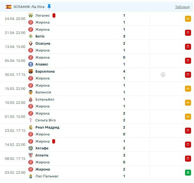 Втім, перемог у «Жирони» нема дуже давно. Безвиграшна серія тягнеться вже 11 матчів поспіль. Останній тріумф команда Мічела святкувала ще 3 лютого, коли з мінімальною перевагою здолала «Лас-Пальмас» (2:1).