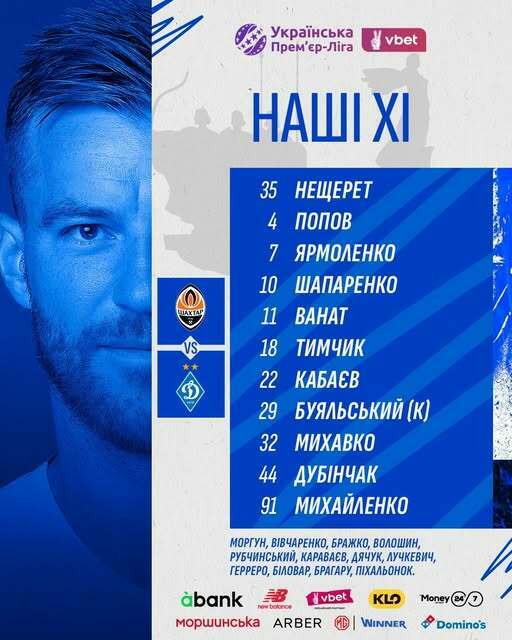 «Динамо» Київ: Нещерет – Дубінчак (Вівчаренко, 90+6), Михавко, Попов, Тимчик – Шапаренко (Бражко, 85), Михайленко – Кабаєв (Біловар, 90+6), Буяльський (Піхальонок, 85), Ярмоленко – Ванат.