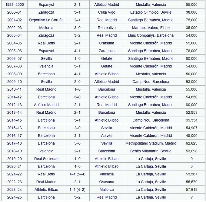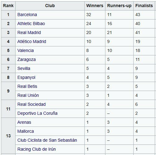 Далі в історичному списку переможців Кубка Іспанії йдуть: Валенсія (8), Сарагоса (6), Севілья (5), Еспаньйол (4), Бетіс, Реал Уніон (по 3), Реал Сосьєдад, Депортіво (по 2), Аренас, Мальорка, Сан-Себастьян, Расінг Ірун (по 1).