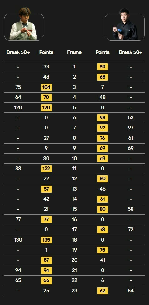 Брейки на 130, 94 та 65 очок дозволили йому виграти чотири з наступних п’яти фреймів і скоротити рахунок до 10:12. Проте, Чжао виграв 23-й фрейм з серією у 54 очки і забезпечив собі місце в чвертьфіналі, де зустрінеться з Крісом Вейкліном.