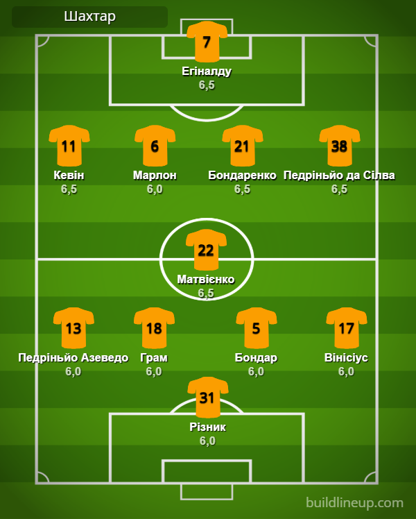 «Шахтар»: Різник – Педріньйо Азеведо, Грам, Бондар, Вінісіус (Криськів, 61) – Матвієнко – Кевін, Марлон (Назарина, 62), А. Бондаренко, Педріньйо да Сілва (Аліссон, 62) – Егіналду (Траоре, 62).