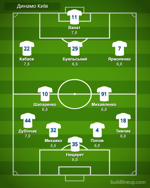 «Динамо» Київ: Нещерет – Дубінчак (Вівчаренко, 90+6), Михавко, Попов, Тимчик – Шапаренко (Бражко, 85), Михайленко – Кабаєв (Біловар, 90+6), Буяльський (Піхальонок, 85), Ярмоленко – Ванат.