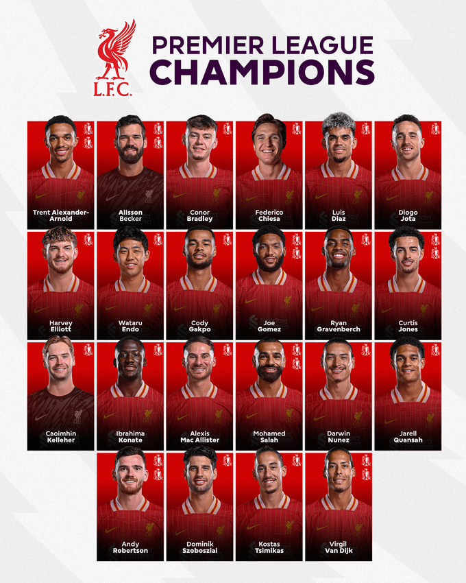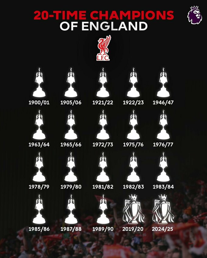 Клуб Ліверпуль став чемпіоном Англії сезону 2024/25, здобувши 20-й титул у своїй історії та зрівнявшись за кількістю чемпіонств з Манчестер Юнайтед.