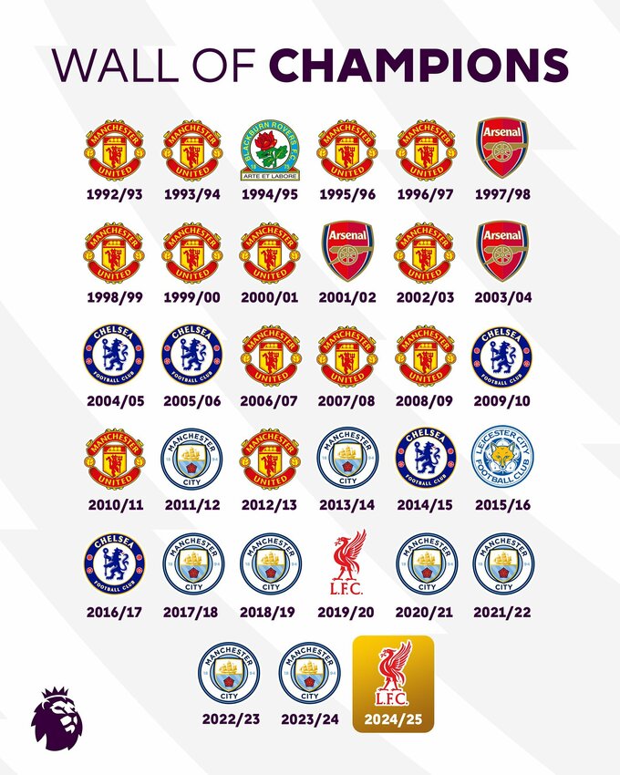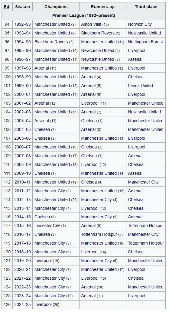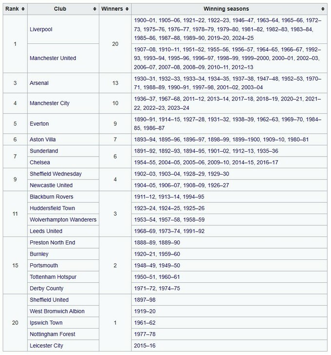 Кількість трофеїв в АПЛ: Ліверпуль та Манчестер Юнайтед (по 20), Арсенал (13), Манчестер Сіті (10), Евертон (9), Астон Вілла (7), Сандерленд, Челсі (по 6),