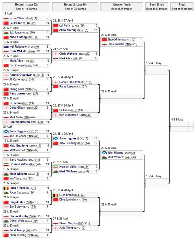 - 21:00. Ронні О'Салліван (Англія) [5] – Пан Цзюнсу (Китай) – 13:4 (підсумок матчу)