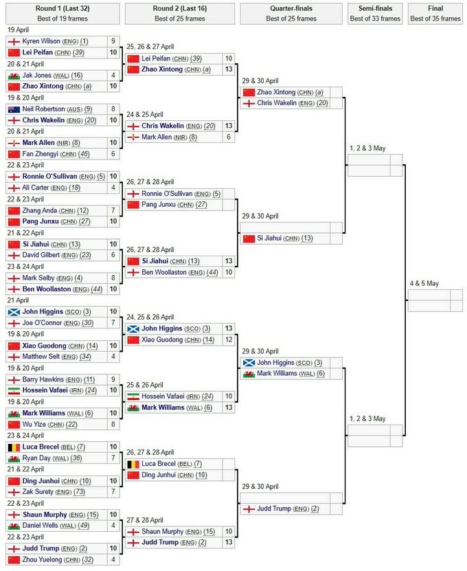 35-річний Трамп програв 5 із 10 своїх попередніх чвертьфіналів, зокрема зазнав сенсаційної поразки від Джейка Джонса минулого року. Він сподівається покращити свою статистику в півфіналі, схоже, проти Люки Бреселя який пройде 29–30 квітня на дистанції 25 фреймів.
