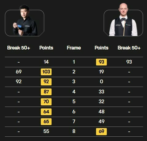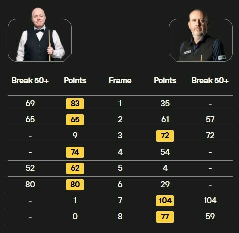 Чотириразовий чемпіон світу Хіггінс після таких фанфар почав гру активніше за суперника, зробив серії 69, 65, 52 і 80 очок і отримав відчутну перевагу в рахунку (5:1).