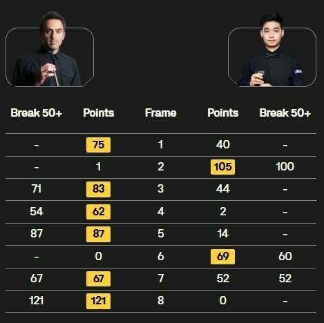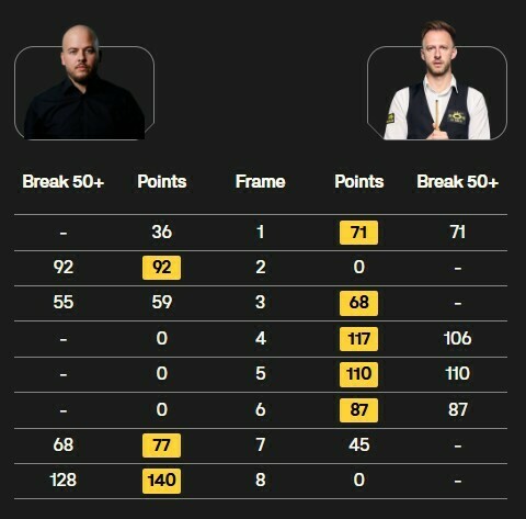 На іншому столі чемпіон світу 2019 Джадд Трамп лідирує у грі з чемпіоном світу 2023 Люкою Бреселем (5:3) після видовищної стартової сесії чвертьфінального матчу.