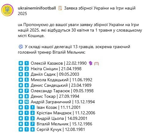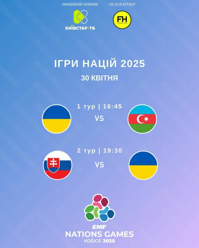 Ігри націй – це важливий етап підготовки до чемпіонату світу 2025 з міні-футболу, який у травні та червні прийматиме Баку. Синьо-жовті на груповому етапі зіграють проти Англії (21 травня), Туреччини (23 травня), Угорщини (25 травня).