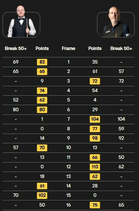 Хіггінс вів 5:1 на ранньому етапі, але Вільямс зумів повернутися у гру й зрівняти рахунок. Обом потрібно ще п’ять фреймів, щоб вийти на Джадда Трампа або Люку Бреселя.