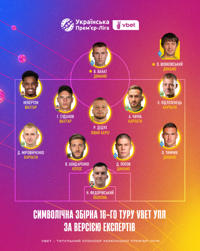 Звання найкращого гравця 16-го туру отримав форвард «Динамо» Владислав Ванат, який відзначився дублем у ворота «Зорі».