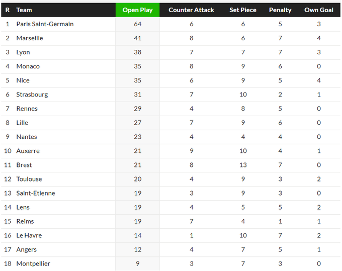 А ось і друга команда з показником у 2+ голи з гри за матч – це «ПСЖ». Її результат навіть дещо кращий, але вона виступає у трохи більш закритому та менш конкурентному чемпіонаті – тому досягнення плюс-мінус співставні. До речі, навіть відрив від найближчого переслідувача такий же – 23 точних удари. А переслідувач – «Марсель», звісно. Де Дзербі дав команді у свій перший сезон дещо менше, аніж від нього очікували, але з гри забивати її навчив – це здобуток, фіксуємо. Цікаво, що третій найкращий у країні не «Монако» – а «Ліон», який почав грати у футбол лише посеред сезону. Шокує і присутність серед лідерів «Страсбура», який небезпідставно асоціюється у нас з вами з контратаками, але ні, він може відзначатися і у позиційні грі. Тобто команда не настільки одномірна, як може здатися на перший погляд. От хто одномірний, так це «Нант», який аж 23 з 35 своїх голів відгрузив з гри. А ще не так давно це була суто контратакувальна команда… Втім, з турнірної точки зору для нього нічого не змінилося: що раніше, що зараз б’ється за виживання.