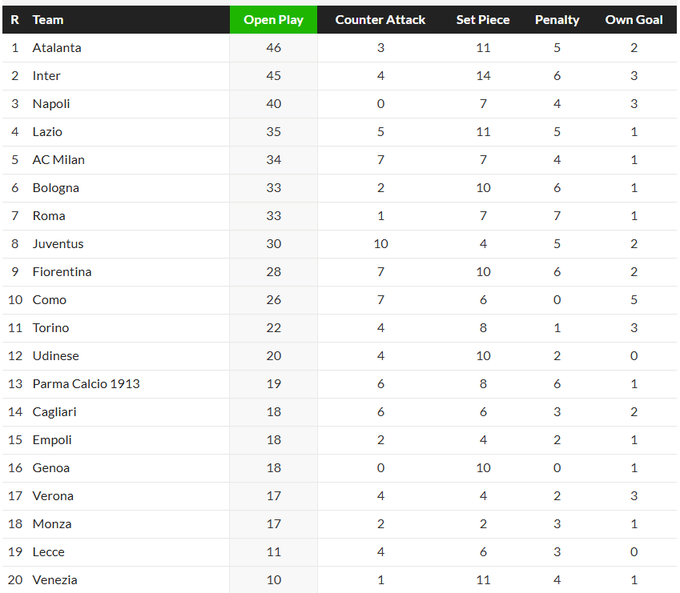 Дійсно поганий сезон від «Ювентуса», очі нас не обманювали: серед іменитих команд він найгірший у Серії А. А те, що він найкращий за голам з контратак, то є мем, адже Мотта приходив у клуб щоб навчити колектив грати у протилежний футбол – у позиційний. Як бачите, не вийшло. Щось схоже відбулося з «Фіорентиною», але та одна з найкращих у країні по варіативності свої голів. Хочете – заб’є у контратаці, якщо треба – зі стандарту, регулярно – з пенальті, а ще додасть у затяжній атаці… Палладіно у перший же рік у клубі збудував команду, яка може ледь не все попереду на непоганому рівні – тому вона й у півфіналі ЛК та серед претендентів на місце у ЛЧ. Взагалі ж, є відчуття, що в Італії найбільше серед усіх топ-ліг вирішує твоє вміння атакувати позиційно, бо клубів, які розривають на стандартах чи у контратаках, геть небагато, а різниця між позиціями у фактичній таблиці та таблиці голів з гри для майже всіх команд складає по 1-2 рядки. Тож не дивуйтеся бажанню італійських босів запросити до себе Мотту чи Фонсеку: вони знають, що якщо в тих все вийде, то їхні клуби будуть домінувати.