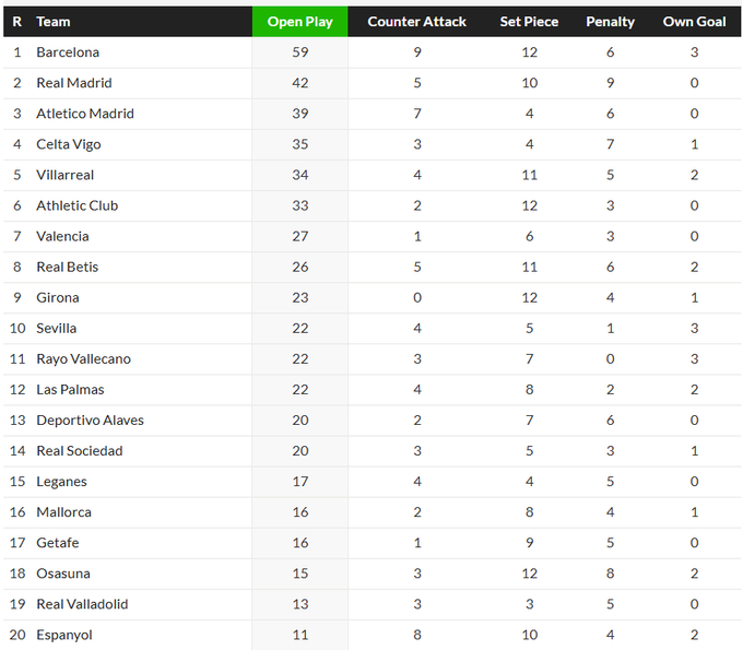 Хто перший? «Барселона». Хто другий? «Реал». Третій? «Вальядолід». Добре, я жартую: «Атлетіко». Ніби нічого цікавого. Втім, висока позиція «матрасників» – доказ того, що Сімеоне все ж відійшов від канонів та навчив свою команду атакувати не лише швидкими випадами та стандартами – але й затяжними розіграшами. Тобто хейтери неправі, коли кажуть, що коуч невдало спробував змінитись сам та змінити свій стиль – цілком успішно. Тут відставання від «Реала» з його зірками лише 3 голи – дуже круто. Єдине що, «Атлетіко» взагалі кинув відзначатися після кутових та штрафних – саме це вибило команду з чемпіонської гонки, саме цих голів не вистачило. Кому голів зі стандартів вистачає, так це «Осасуні», яка у топ-3 найгірших по забитих у звичайних атаках – але у зоні єврокубків у турнірній таблиці. Ви уявіть: ми можемо отримати замість «Бетіса» у цьому сезоні у ЛК клуб, який витрачає майже 200 хвилин на 1 гол з гри, у наступному! Тому треба цінувати «Бетіс». Хоча наприкінці сезону доцільніше цінувати більше за інших не цю команду – а «Сельту». Найкраща атака без урахування топ-трійки.
