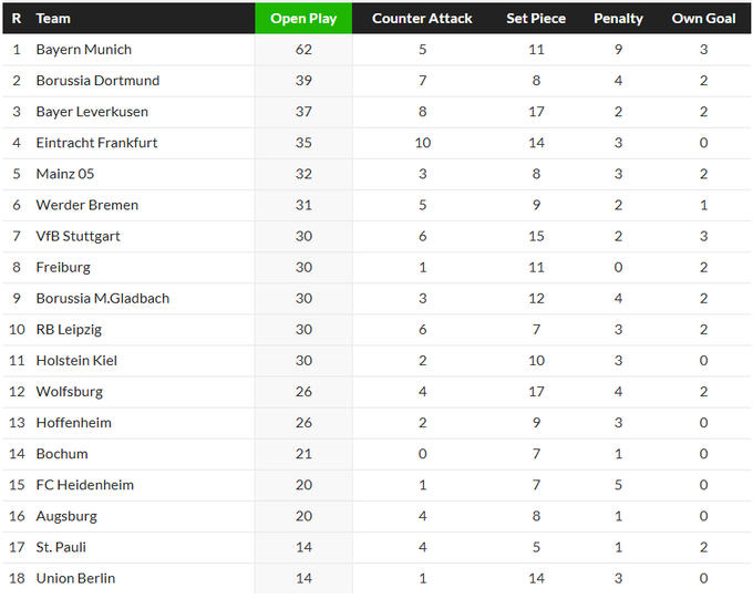 «Штутгарт» – це локальний «Тоттенгем», Також знає, що робити з м’ячем у ногах в атаці, але нічого не може заподіяти, коли суперник вже сам нападає. Тому низько у таблиці очок, але високо у переліку команд з найбільшим показником голів з гри. Для інших команд усе плюс-мінус справедливо, хіба що «Бохум» на останньому ряду, а міг би бути вище, навіть поза зоною вильоту, якби все вирішували суто голи у позиційних атаках. Проте він сам винуватий: взагалі не забиває у контратаках та пропускає м’ячі один за одним. Ну і декілька речень про домінування «Баварії»: воно абсолютно шалене. Різниця із найближчим переслідувачем – аж 23 м’ячі! Вона досі єдина у нашому матеріалі, хто забиває у середньому 2+ за поєдинок з позиційного нападу. Тобто просто нема нікого більш продуктивного та, що не менш важливо, сконцентрованого саме на цьому компоненті гри. Ми чекали чогось подібного від Компані, але поставити настільки домінуючу у країні позиційну атаку – це справді досягнення. В теорії, на другий рік може стати ще краще, бо команда повинна додати у зіграності. Чекаємо з нетерпінням.