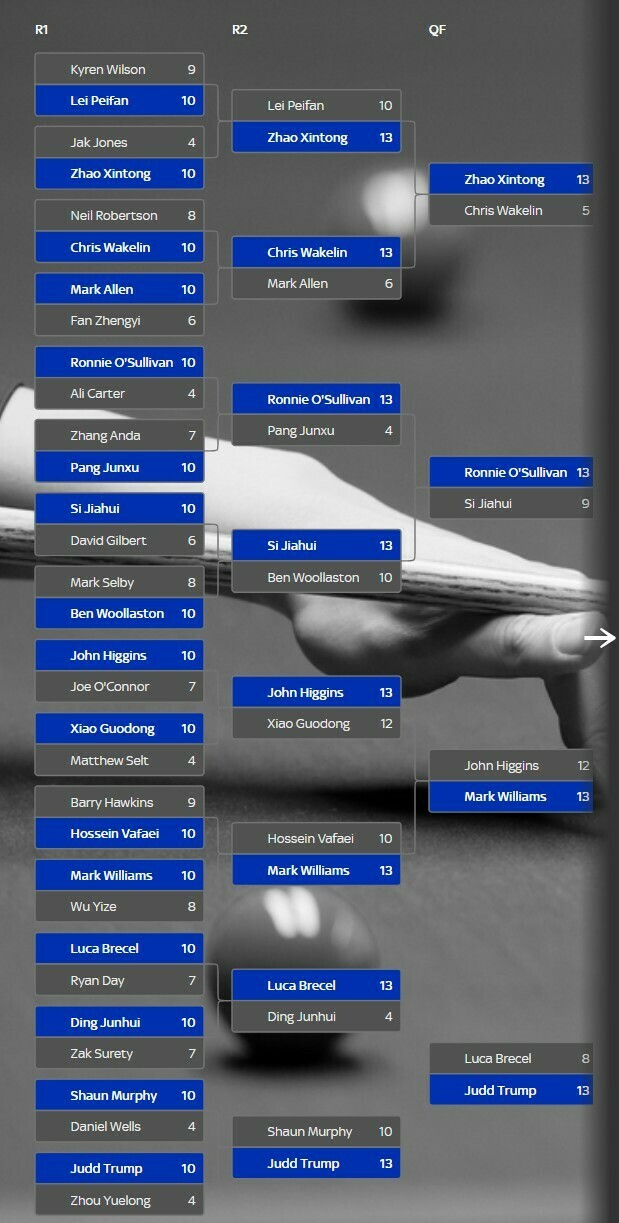- Ронні О’Салліван (Англія) [5] – Сі Цзяхуей (Китай) [13] – 13:9